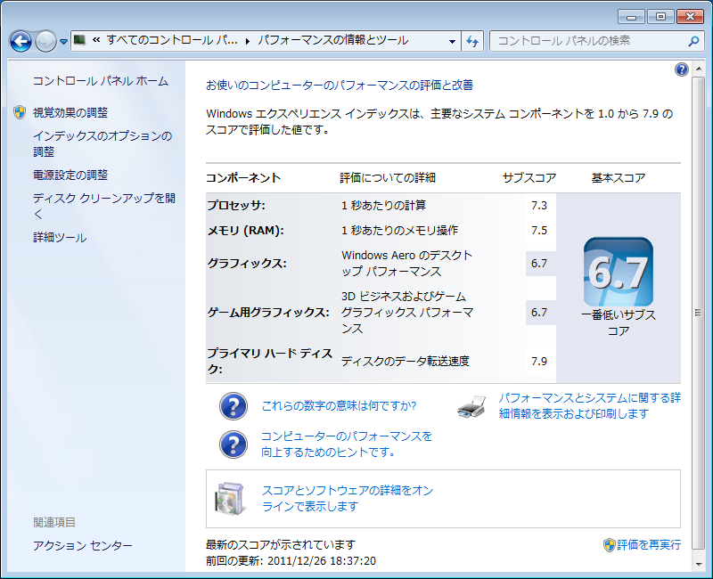 Windows 7の頃に測ったのはこちらなのですが、PCの構成は変わらずとも、OSが求める性能が微妙に違う為か、数値は微妙に違うんですね。