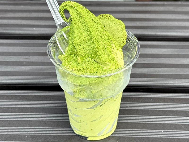 で、その手にしたものとは、抹茶ソフトクリーム。個人的にこの手の食べ物は好きなんですけど、このところご無沙汰だったんですよね。ちなみに、店頭に貼られたPOPによると、抹茶ソフトには通常のものと特製があったので、迷わず特製に。POPの写真だと、ソフトクリームそのものも色味が特製のほうが濃いようにに見えますが、他にも特製だと、コーンがワッフルコーンに替わり、ソフトクリームの上には抹茶が振り掛けられ、抹茶色のビスケット?が添えられているなど違いがあるようで。もっとも、確認したらコーンじゃなくカップでも大丈夫とのことなので、写真撮影に都合が良いカップに入れてもらいました。