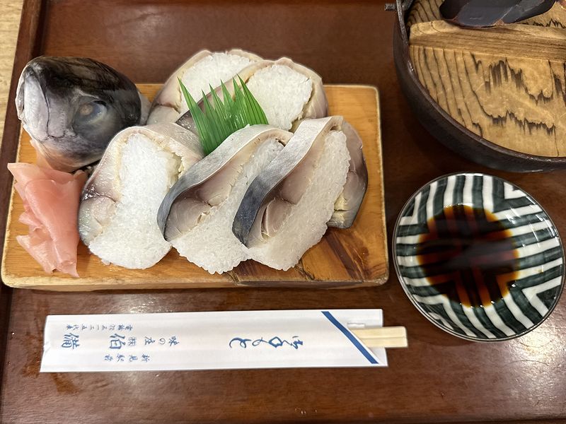 もっとも、流通が発達して山あいでも海産の鮮魚が容易に手に入る用になった現代では、塩鯖ではなく生鯖を使用して作ることもあるようで、こちらのお店のも、生鯖を酢締めしたものでしょうか?肉厚だけど、しっかり目の締め加減がいい感じ。そして個人的には鯖よりも感心したのが、もち米入りというシャリ。そのもっちり、どっしりとした食感もそうですが、お酢と甘みの味加減が何とも私好み。それが前述の鯖と合わさって、これがなかなか。食べ応えもかなりのものでした。