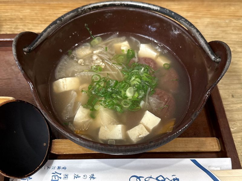 で、まずは汁からいってみると、あっさりとした中に、出汁や具の鶏肉、根菜類から出た旨味が溶け込んだ上品な味わい。また、名前の元のタカキビの団子は、赤茶色の平べったく丸いもので、タカキビはタンニンを含むため渋みがあるとされているものの、野方粉にする段階で手間を掛けてアク抜きされる為それは無く、柔らかい食感と、個人的には馴染みがない穀物的風味の中に染みた汁の旨味が何とも滋味深く、良い感じでした。
