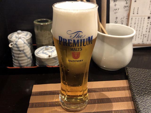 で、席に着き早速注文なのですが、水炊きは必ず頼むとして、とりあえず生ビールを。こちらのお店はプレモルなんですね。また、それと一緒に出てきたお通し(税別500円?)は、枝豆、大根とひき肉の炊いたの、おひたしの3種。この、ちょっとづつというのが嬉しく、また味付けも程良いので、生ビールが進みます。
