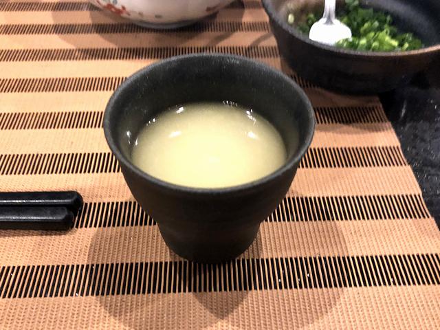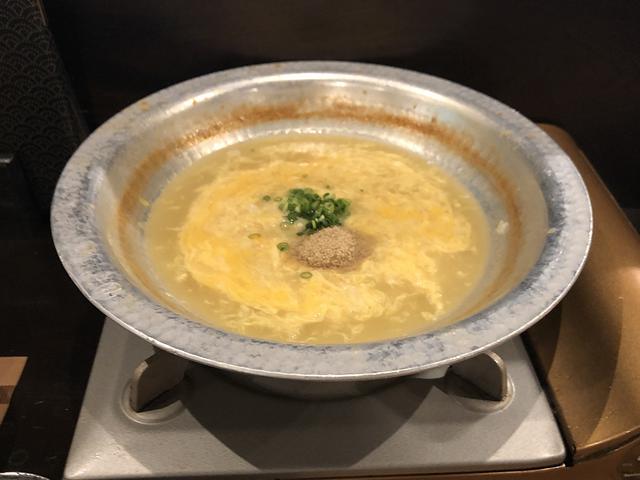そんなわけで酒が進みすぎてしまった(1杯じゃすまなかったのよ……。)ので、具材の追加はせずに〆の玉子雑炊を注文。酔っ払って舌も記憶も少々怪しくなってきたところだったのですが、それでも感じるご飯に染みたスープ旨味とそれを包む玉子の優しさ。お茶も出して貰い、口の中をスッキリ、気持ちもホっとして食べ終えました。