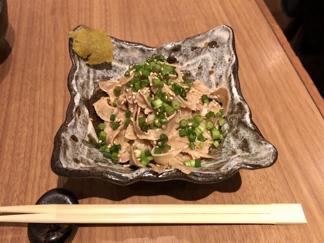 なので早々に飲み干し、焼酎にチェンジ。折角なので博多のをと思い、一番安いので申し訳なかったのですが、博多小女郎という銘柄の麦焼酎を。で、これが香り華やか味わいスッキリで思いの外美味しかったというか。加えて、一緒にいただいた鶏皮ぽん酢が、これもまた。炙ったスモーキーな風味が香ばしく、皮自体の滋味と相まって、更にそこに、青ネギと玉ネギの爽快感が加わり、それらを旨いぽん酢がまとめます。あと、火の通し加減の所為か切り方の所為か、歯応えが良すぎないのも良かったですね。
