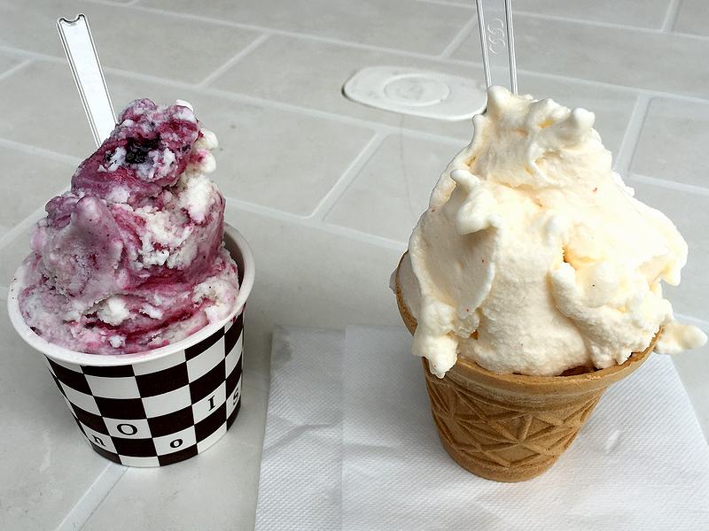 それが、写真向かって右手の「とうがらし」。ミルクジェラートの中に大田原特産の唐辛子が入っているのですが、最初の一口目はミルク感のある味わいから、徐々に口の中に蓄積していく辛味で、冷たい物をいただいている筈が汗が出てくるという不思議な一品。でも決して奇をてらっただけではない味というか、この辛味と唐辛子の風味がジェラートに絶妙なアクセントを加え、個人的には完成度高いと思いますね。それと左手の方が、相方がいただいたブルーベリーマーブルで、ちょっとだけ味見させて貰いましたが、こちらも大田原特産のブルーベリーが間違いの無いのないお味かと。あと、食べ比べて改めて感じるのは、ベースとなっているジェラートの美味しさ。まろやかかつサッパリ感があって、そのお陰でそこに加える食材の風味が派和田積んだなぁ、と。