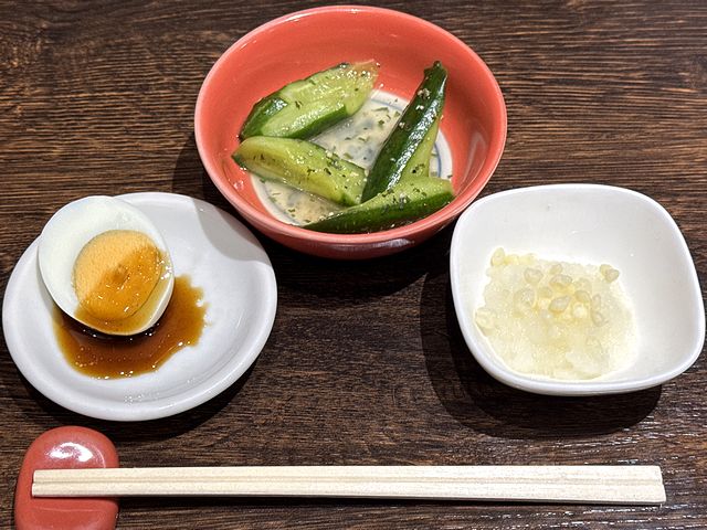 それとお通しは、叩きキュウリ、ゆで卵+ウスターソース、大根おろし+あげ玉の3品。中でも大根おろし+あげ玉は、個人的に初めていただく組み合わせだけど天つゆの例もあるので相性良いよね、というわけで、自宅でもやってみようと思いました。
