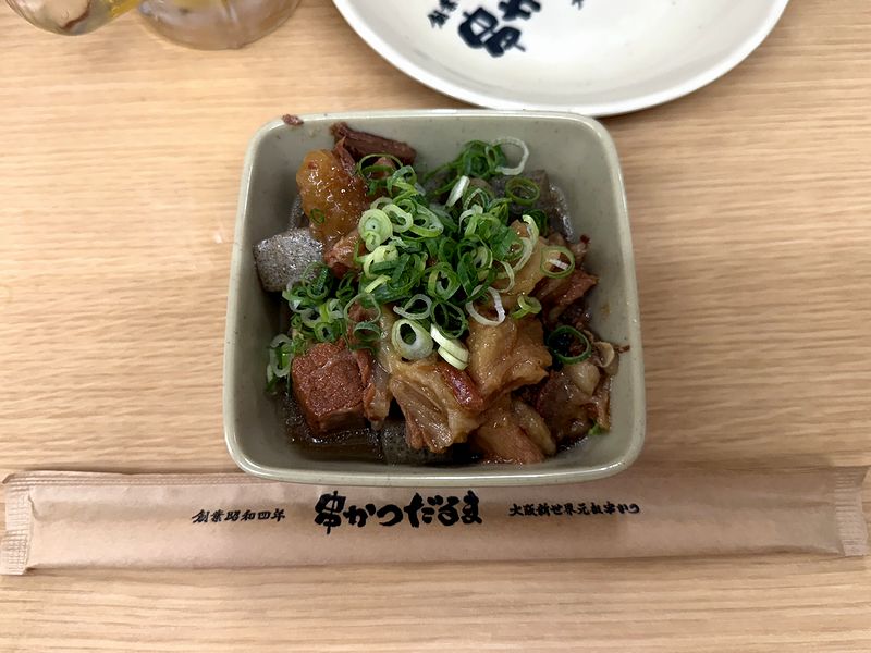 と、串かつの話から書いてしまいましたが、まずは最初に出てくるどて焼きから。当地の「どて焼き」は牛すじの煮込みのことで、串かつよりも当地らしい品かもと思ったりもするのですが、こちらのは、腱のほか、肉も多く入りお得感がありますね。あと甘みの効いた味付けも良い感じ。七味をたっぷり振っていただくと、たまりませんね。