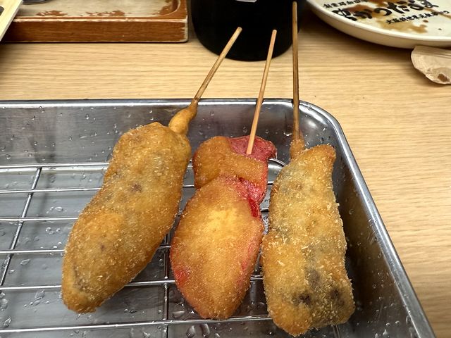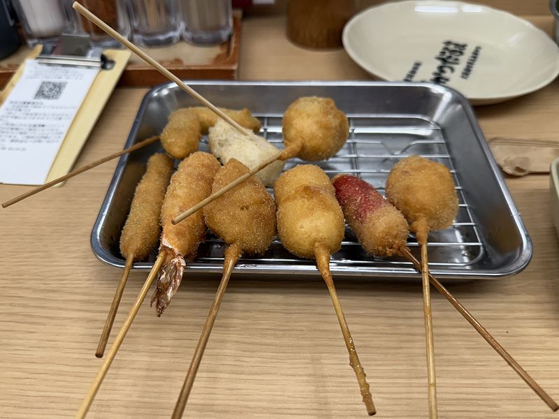そして串かつは、元祖串かつ(牛肉)、天然海老、うずら、アスパラ、もち、豚かつ、チーズちくわ、ウインナーという構成。どれもサクッとした薄衣に、適度に火が通った種が悪くないというか。