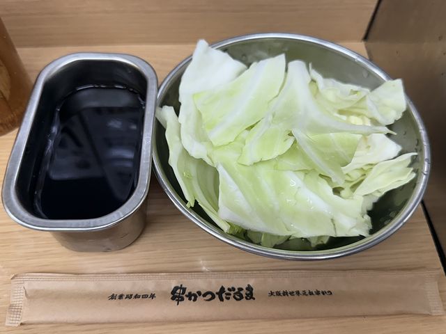 そしていただくメインの串かつは、どて焼きとメジャー串かつ9本がセットになった、ジャンジャンセット。昔はソースの入ったバットがカウンターに置いてあり(共用だったので二度漬け禁止)、またキャベツは無料で食べ放題だったのですが、コロナ禍などを経た今では、ソースとセットで一品になっていたという。もっとも、卓上にはスクイーズボトル入りのソースも置いてあったので、それを使って食べることもできるようですが、やっぱり当地の串かつは、バットのソースにざぶんと漬けて、合間に生キャベツで口直ししながら食べないと、気分が出ませんからねぇ。