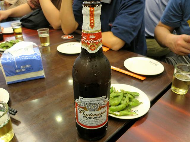 この日は店内に、いわゆるバドガールの格好をしたお姉さん(啤酒小姐というらしい)が居て、お願いすると愛想良くビールを出してくれたのですが、普段はセルフサービスで冷蔵庫から各自勝手に持ってくるシステムになっているようで。で、バドガールということで、折角だから百威啤酒(バドワイザー)からいってみたのですが、どこでいただいてもすっかりお馴染みの味というか。この軽さというか薄さ、個人的には嫌いじゃないです。