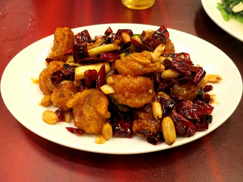 日本語の説明書きには「エビの唐辛子炒め」とあるのですが、衣を付けて揚げた海老と、ピーナッツ、そしてネギなどを唐辛子を炒め合わせたもの。で、見た目どおりとっても辛いのですが、これがものすごく後を引くというか。一口食べて「旨いっ!でも辛いっ!!」とビールをグビグビ。で、ほとぼりが冷めるとまた一口食べて「旨いっ!でも辛いっ!!」とビールをグビグビ。(以下エンドレス。)そんなわけで何とも危険な食べ物でしたが、これは是非、またいただいてみたいですね。