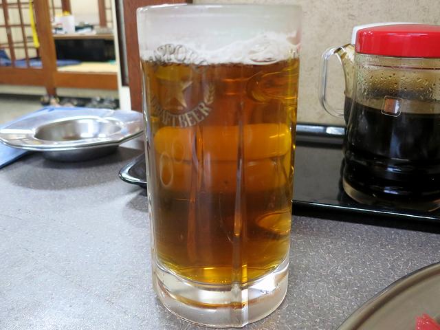 こちらのお店、お品書きを見ると、置いてあるビールは4種類あり、これの他、ハイネケン(海尼根)が300mlで100元、金牌と付かない台灣啤酒(台湾ビール)が600mlで100元、アサヒスーパードライ(朝日啤酒)が633mlで130元。ml当たりの価格だとハイネケンが一番高いんですね。で、いただいた金牌台灣啤酒ですが、飲み口はとても軽快。言い方を変えれば若干薄い感じがするのですが、逆に暑い台湾でいただくにはぴったりなんじゃないでしょうか。ほんと、水のようにゴクゴクいけちゃいます。