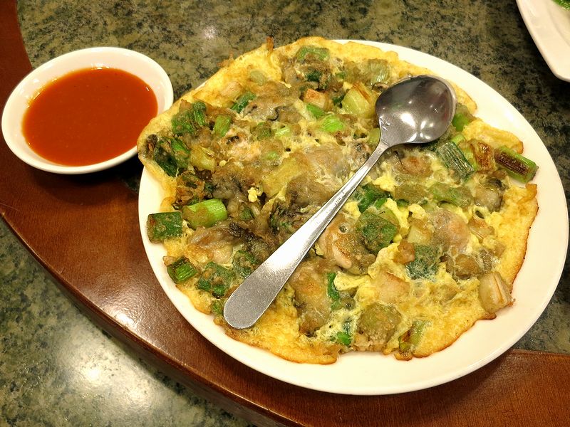 こちらは、「カキのオムレツ」。実は私のリクエストで注文したもので、確か台湾や東南アジアではメジャーな料理だと思います。で、当然ながら台湾でいただくのは初めてだったのですが、片栗粉を混ぜたようなサクっとした食感の卵の中には、ネギと、当地らしい旨味が強い小ぶりな牡蠣たっぷり。赤っぽい色のタレは甘味が効いていて、辛味は見た目ほどじゃないというか、ややピリっと来る程度。カキが(食中毒的に)恐いとのことで、皆あまり箸が進まなかったのですが、その分私が責任を持っていただきました。もちろん、お腹は何ともありませんでしたし、何より旨かったですよ。