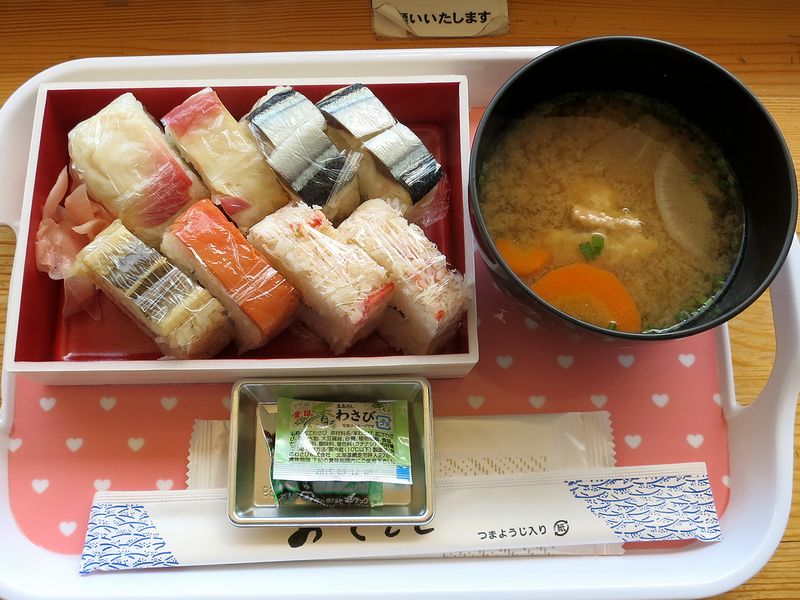 それでチョイスしたのがこちらの品。かにの押し寿司、かにの太巻き、紅鮭の押し寿司、ほっき貝の押し寿司、さんまの押し寿司、穴子の押し寿司から組み合わせ自由で8個選んで折に詰めてくれるというシステムになっているのですが、同行者と協議した結果、かに(押)とほっき貝、さんまが各2個、紅鮭と穴子が各1個という組み合わせなりました。で、基本的に全部、ネタもシャリも丁度良い塩梅の押し寿司なのですか、中でも地元産のほっき貝は旨かったです。あと、館内でいただくとサービスになる味噌汁も美味。この日はあら汁っぽいものだったのですが、ダシが良く出ていました。