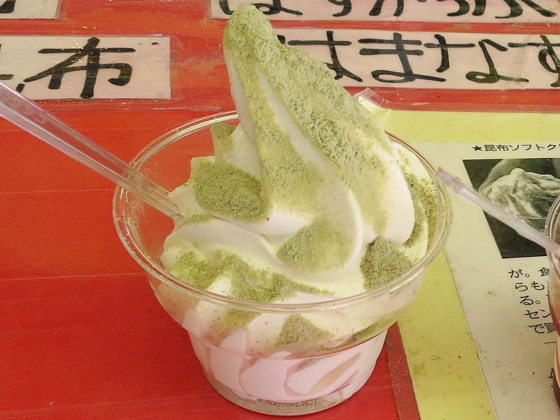 それがこの昆布ソフト。作るところを見ていると、まずカップの底に昆布パウダーを投入したのち、マシーンからソフトクリームを絞り入れ、そして仕上げにまた昆布パウダーを、写真でも判るとおりたっぷりと振りかけるという、それだけで結構手強そうな感じが。で、店のお姉さんが「よく混ぜてお召し上がり下さい」とのことだったので、そうしてからいただくと、バニラアイスに昆布パウダーの塩気がマッチして、今流行の「塩スイーツ」といった感じの味わい。もっとも、その塩気の後に、昆布が持つ旨味と、更にその後方から磯の風味が追いかけてくるのですが。そういえば昆布って、昆布飴とか、昔からお菓子に使われてきた食材なので、そうそう変な味にはならないよなぁ、なんて思いながら完食いたしました。