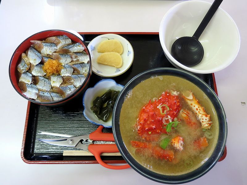しからばといただいたのが、こちらの名物であるさんま丼と、花咲ガニの鉄砲汁を組み合わせたこのセット。っていうか、こちらのお店についてネットで調べた時に一番出てきた品がこのセットだったりしたんですよね。それでまずはさんま丼ですが、丼の表面には銀色に輝く、いい塩梅に味の付いたサンマが一面に敷き詰められていて、それをご飯と共に豪快にいただけば、もう!まだシーズンには若干早いためか、サンマは冷凍物(その旨ちゃんと表記してあります。)ですが、それでも十分美味しいですね。(むしろ、冷凍物の方が、寄生虫に対するリスクが無くなって良い面も。)また鉄砲汁は、今がシーズンである筈の花咲ガニの旨味、そして風味が汁に溶け込んで、こちらも美味。そしてボリュームも結構あります。ただ、カニ(厳密には、花咲ガニはカニじゃなくてヤドカリの仲間なんですが。)汁の常で冷めてくると若干風味が落ちるように感じるのですが、そのつくり故にスピーディーにいただけないのが少々もどかしいというか。でも、殻ごと煮ないとこの味は出せないんですよね。あと付け合わせの昆布の煮物が、何気に良かったというか。