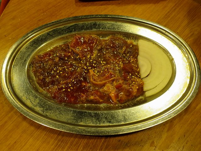 それで色々といただいたのですが、こちらのお店では、あらかじめ肉と野菜がセットになっているのではなく、肉は肉、野菜は野菜で別に注文するシステムになっているんですね。で、どれもすこぶる付きで美味しかったのですが、個人的に一番気に入ったのが、キングマトン。マトンの肩ロースの部分だそうですが、お肉というか脂というか、それ自体が持つコクがたまらなく、個人的に今までいただいたマトンの中でもこれがベストと言える味でした。(まぁ、ジンギスカン自体そんなにいただいたことがあるわけではないのですが…。)また、同行者が一番気に入ったと申していたのがラム(塩)。こちらは、比較的あっさりとしたラム肉にこれまたあっさりとした塩ダレがベストマッチ、という感じでした。もちろん、これ以外のお肉も、味付けのタレは良い塩梅に効いていますし、肉本来の味の違いも十二分に堪能出来て、大満足。それと、一緒にいただいたいなきび飯は、ぷちもちした黍とほっくりした豆食感が面白く、ジンギスカンとの相性も良かったです。