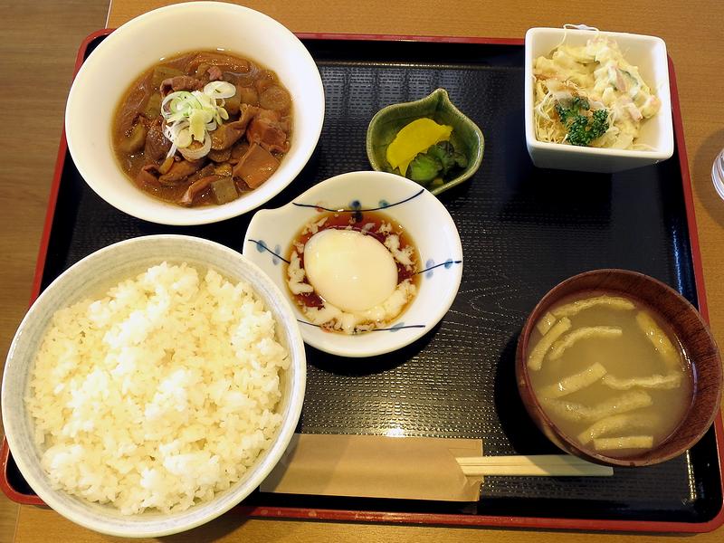 そこでいただいたのが、個人的好物のもつ煮の定食。ちなみにご飯の大盛りは無料で、ものすごくボリューミーになるのですが、今回は普通盛りで(それでも十分多いと思いますが)お願いしました。で、早速もつ煮をいただけば、柔らかいモツに、濃いめの味が染み染み。ちなみに味付けはあまり味噌味噌した感じでは無く、また甘味が効いていてご飯に合います。また、モツ以外の具は、定番のこんにゃく、大根、天盛りの白ネギの他、小口に切られたゴボウが切り方を含めちょっとだけ珍しく感じました。それから、小鉢にマカロニ(ポテト?)サラダが付くのですが、添えられたキャベツにちゃんとドレッシングが掛かっていましたし、更には別の小鉢に半熟玉子まで付くのががどちらも嬉しかったです。
