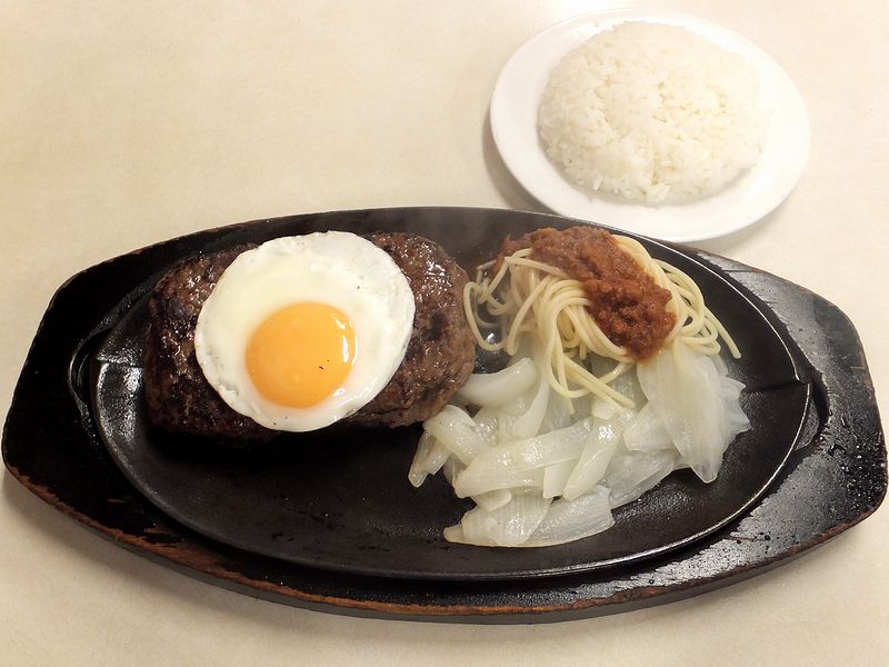 こちらは、同行者がいただいたというか、私がいただく分も考慮して(無理矢理)Lサイズでお願いしたのですが、Lサイズだと、なんとハンバーグが2枚重ねになって来るのですね。(その際、近くのお客さんに物珍しそうにガン見され、同行者がたいそう困っておりました…。)それでお味の方ですが、ハンバーグ本体は昨今流行りのふっくらジューシーというタイプではなく、薄手ながらミシっとした噛み応えの密度感そして「肉」の存在感のあるもの。味付けはステーキ同様、卓上に豊富に用意された調味料類を使用するのですが、こちらのNo.1ステーキソースはハンバーグにも合いますね。また、ケチャップをかけると大層懐かしい感じになって、個人的にツボでした。それにしても、このボリュームで900円というのは、ものすごいコストパフォーマンスなのではないでしょうか?