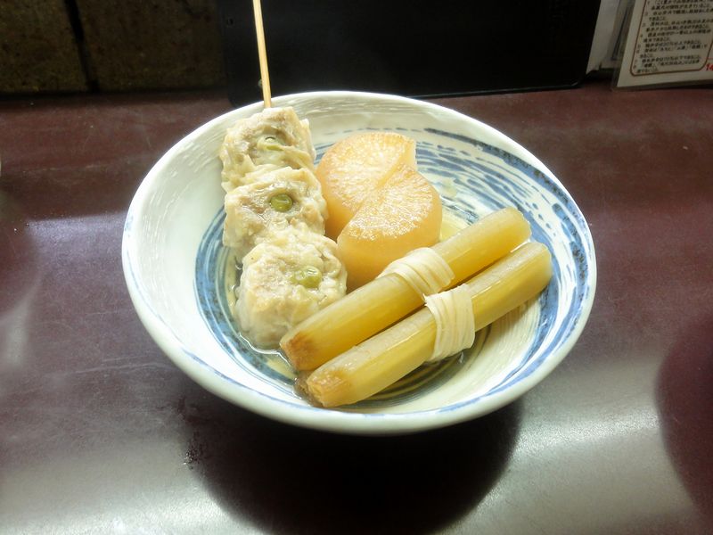 最初に発注したのがこれらの品々。ジャガイモなどは包丁で切ってくれるのが嬉しいですね。で、どれも美味しかったのですが、特に当地のおでん独特と思われる車麩は、旨いダシの味をたっぷり吸って最高です。また、鰯つみれは鰯を骨ごと叩いたかの様な食感が良いですね。それとロールキャベツは、中身が挽肉メインではなく白滝や刻んだ赤巻などが入っていて面白かったというか。