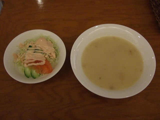 フーチバージューシーは、ヨモギ(正確にはニシヨモギか?)の入った炊き込みご飯(フーチバー=ヨモギ、ジューシー=雑炊・炊き込みご飯)、素朴な味わいと独特の香りが美味。ラフテーは、豚の皮付き?三枚肉を甘辛く煮た、いわゆる角煮。味付けは味噌のように感じましたが、味が染みてトロッホロッとした食感の豚肉がとても美味。