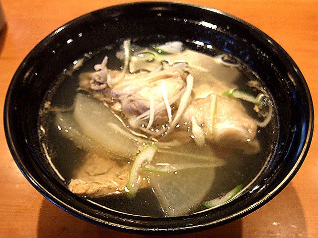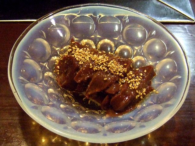 と、前置きが長くなりましたが、早速焼いていただくと、これがまた。お勧めされたレア状態でいただくと、フルーティーな甘味の効いたタレの染み込んだ柔らかいお肉が堪りませんね。ロースはジューシーで癖が無く、ラム丸は脂身とのバランスが良い感じで、マトンは「羊!」という風味と深い味がタレと良く合っていて、どれもとても美味しかったです。また、注文する時「大丈夫かな?」と思った羊のレバ刺しなんですが、ゴマ油ベースのタレと拍子木切りの大根と混ぜていただけば、プリプリサクサクっとした新鮮な生レバーの食感と、牛や豚とはちょっと違う濃い目の風味が美味しかったです。