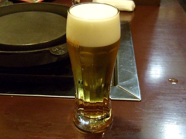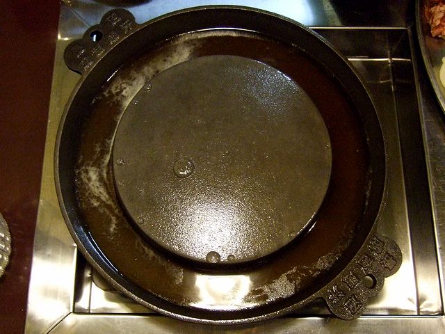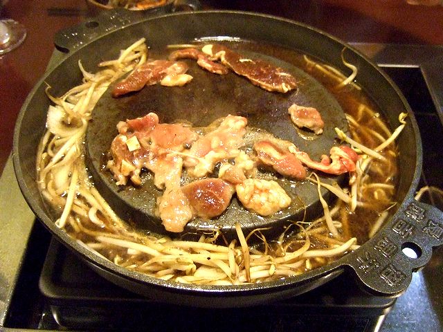 お店に入り、予約していた席に案内されると、まず飲み物の注文。生ビールがサッポロクラシックではなくアサヒスーパードライなのが珍しいですね。(ちなみに、サッポロクラシックは瓶のが置いてあります)。そして、肉類が登場すると、店員さんが親切に焼き方を説明してくれるのですが、独特の形状の鍋は、中央部の平らなところで肉を焼き、周囲の溝のところでタレと水を沸かして野菜を煮るとの事。また、肉を焼くと出来る焦げは周囲で煮ている野菜でこそげ、その水分で溶かすと良いとの事でした。