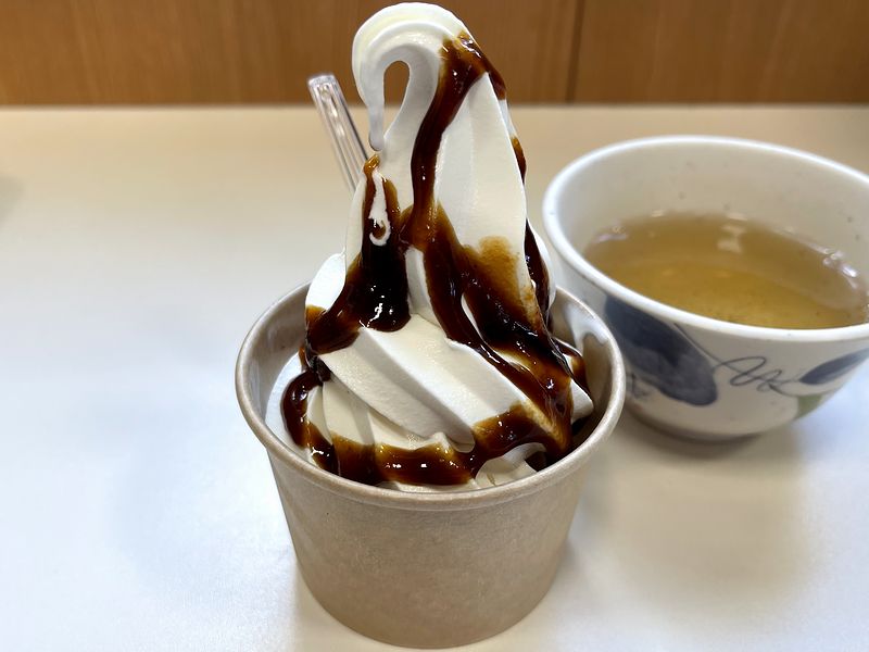 そこには、「当店オリジナル!ご当地ソフトクリーム みそソフト バニラアイスにあま~いお味噌かけちゃいました。(赤字で)おすすめです!」と書かれており、ネタ的アイスやソフトクリームには目がないので、思わず食後に追加注文してしまった次第。