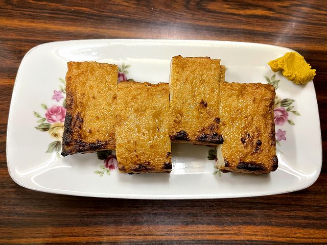 壁の短冊に書かれた「マフラー」という文字を見て???となり、店主さんに尋ねたところ、冷蔵庫から出して見せてくれたのが、さつま揚げのような練り物。後で調べたところ、北海道の一部では、細長い形状のさつま揚げを首に巻くマフラーに見立ててこう呼ぶらしいですね。(ズバリそういう商品名で売られているものもありました。)せっかくなので注文すると、焼台で軽く炙っての登場となりました。