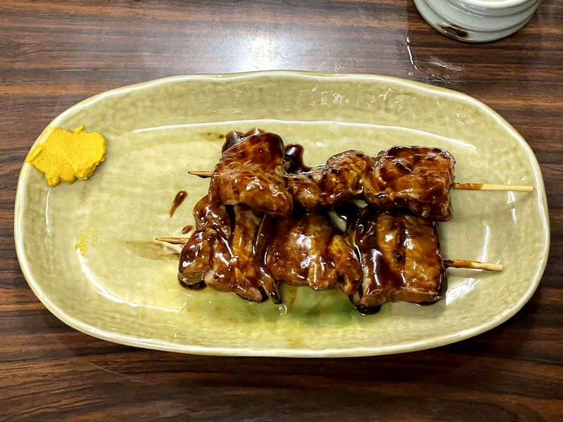 当地というか、室蘭で焼き鳥といえば、豚肉を串に挿して焼いたもの。っていうか、北海道なら函館のハセガワストアで売られている焼鳥弁当が有名ですが、埼玉県の東松山市など、豚肉の串焼きを「焼き鳥」と称するところは全国的に結構あるんですよね。それでお品書きには、好物の内臓系もあったものの、この日は精肉しかないとのことで、それを2本注文。