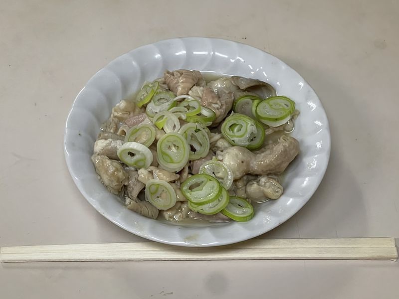 最初に頼んだツマミは、名物というモツ煮。登場したら、まずは色で驚いたのですが、豚と思われるモツが白いんです。塩味なんですかね。