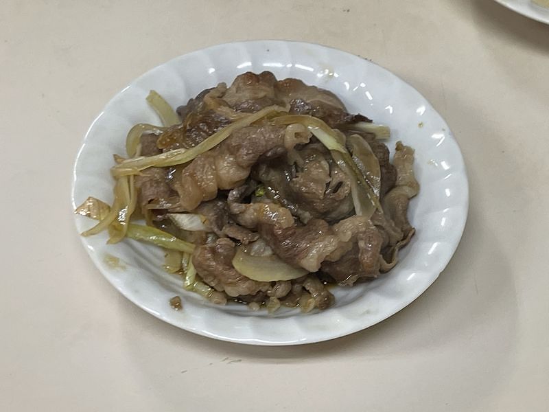 更に、もう1種類くらいつまみが欲しくてお願いしたのが、これまた名物という肉皿。都度調理のようで、注文からほんの少し経っての登場となりましたが、皿の上には照りのある牛肉と葱類が。そういえばこちらのお店には行丼がメニューにありますが、これはそのアタマの部分ですかね。