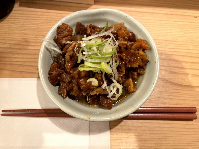 それで牛すじ煮込みは、トロトロっというよりも、濃い味が染みたお陰でちょっと水分抜けている感。その味付けは結構甘みが効いています。また具は牛すじの他、コンニャクと大根が嬉しいですね。