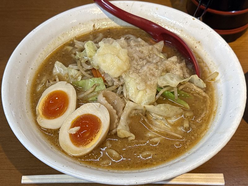 そして半ライスは、豆板醤を加えたことでチープなご飯の香りが緩和され、更には、唐辛子の切れ味によってコッテリマッタリした特味噌スープとの相性を爆上げ。