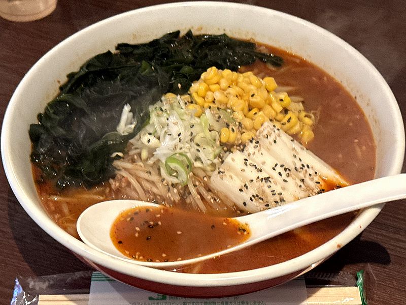 早速スープからいってみると、サラっとした口当たりにアッサリ感のあるベースに、具材からの旨味でしょうか?それも加算。そこに少し甘みのある味噌味、そして唐辛子の刺激が、もう。ちなみに辛さは、「えっ?1.5番でこんなに辛いの?」と驚きつつも、十分に味わっていただけるレベル。もっとも、口中に辛味の蓄積する後半は、それがだんだん怪しくなってきましたが。