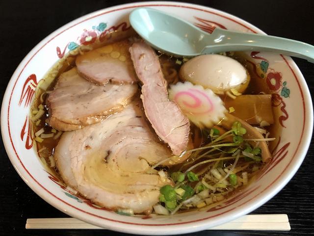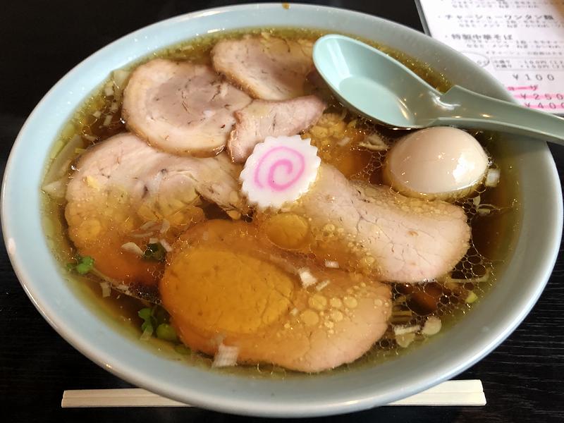 それで今回いただいたのが、チャーシューワンタン麺(1150円)を大盛りにして、更に味玉を追加してしまうという、何とも品がないというか、金にものを言わせたチョイスというか。で、早速スープからいってみたところ、以前と若干印象が違う気が。というのも、以前は動物系の旨味というかエキス分がガツンと来た記憶があるのですが、今回のは醤油とのバランスが良く、何ともジェントルな味わい。更に表面にはわりと油も浮き、そのコクもあるのですが、後味はキレがあるというか。(もっとも、以前こちらでいただいたのが3年も前なので、多分に記憶違いの可能性はあるんですが。)また麺は、手打ち麺らしいなめっこさというか、ほんと、良い感じの食感が味わえます。そして具は、いわゆる全部載せ状態なのですが、「肉」が味わえる香ばしいチャーシューや、黄身が絶妙の半熟具合で味加減も絶妙な味玉、そして存在感がありつつ滑らかな皮の食感が楽しめるワンタンと、豪華スター共演という感じで。今回は久々ゆえ、勢い余って大盛りにしてしまったのですが、難なく完食・完飲でございます。