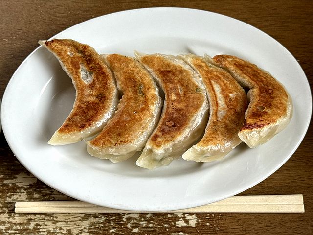大ぶりな餃子は、適度な厚みの皮が、焼き目がカリっと。中の餡は、適度なジューシーさがあり、野菜と豚肉が好バランスで、ニンニクのパンチがたまりませんね。