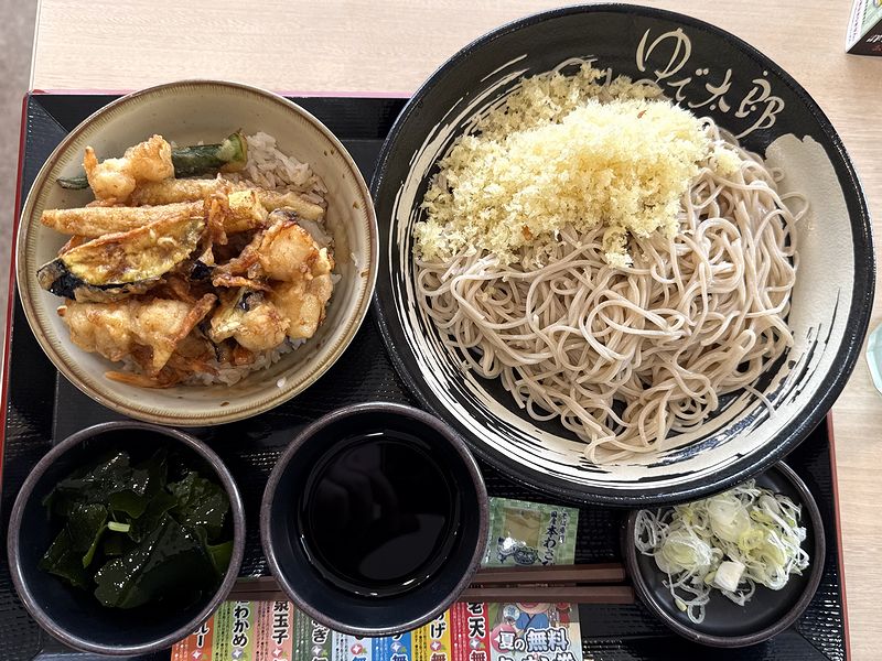 ゆで太郎さんの、(令和7年)6月の期間限定メニューである、小柱と夏野菜のかきあげ。月が変わって早々の前回は冷そばをいただきましたが、今回はミニかき揚げ丼セットの方をいただくべく、いつもの氏家店まで。それで食券購入時、このところ食欲がぶっ壊れ気味なので、ミニ丼セットなのにソバを大盛りにしてしまったのに加え、食券提出時に前回の訪問時にいただいたクーポンで、三陸わかめも追加してしまいました。