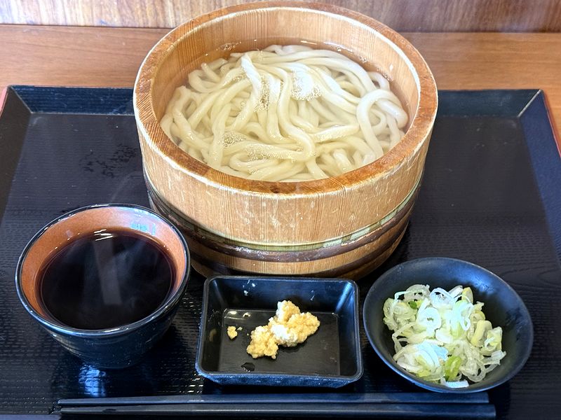 いただくのは久しぶりでしたが、茹でている釜から直接桶に盛られたウドンは、口当たりの滑らかさはあるものの、ツルシコというよりもモチムチした食感が身上。あと、釜揚げだと麺を締めていない分、柔らかめな食感となるのも個人的な好みに合っています。