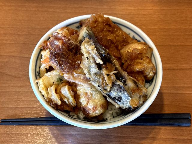 で、毎回だいたい同じだけど微妙に変わる天ぷらは、ナス天、鶏天、ちくわ天、かき揚げ(半分くらい)と、他にももう1種類くらい入っていたかも。揚げ置きの天ぷらに、小鍋で甘辛いタレを煮絡ませて作るので、一般的な天丼とは別物の食感ですが、却ってそれが、実家の祖母が前の日の残りで作ってくれた天丼を思い出させてくれるというか。