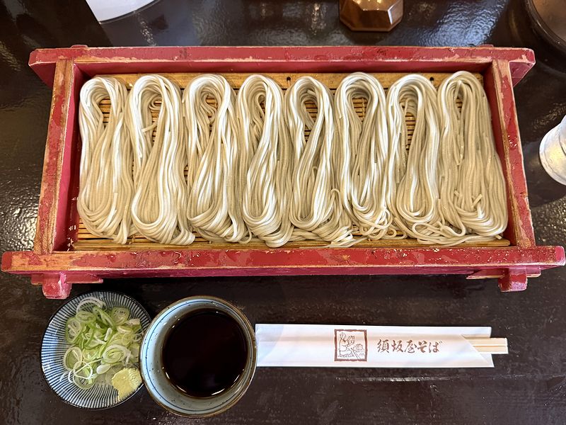 程なくして番号が呼ばれ取りに行った帰り、無料コーナーで天かすをソバの上にドサーっと。今回は、冷やしたぬきそば(当地の冷やし・ひたしの方でなく、関東圏で一般的な方)のように食べたかったので。
