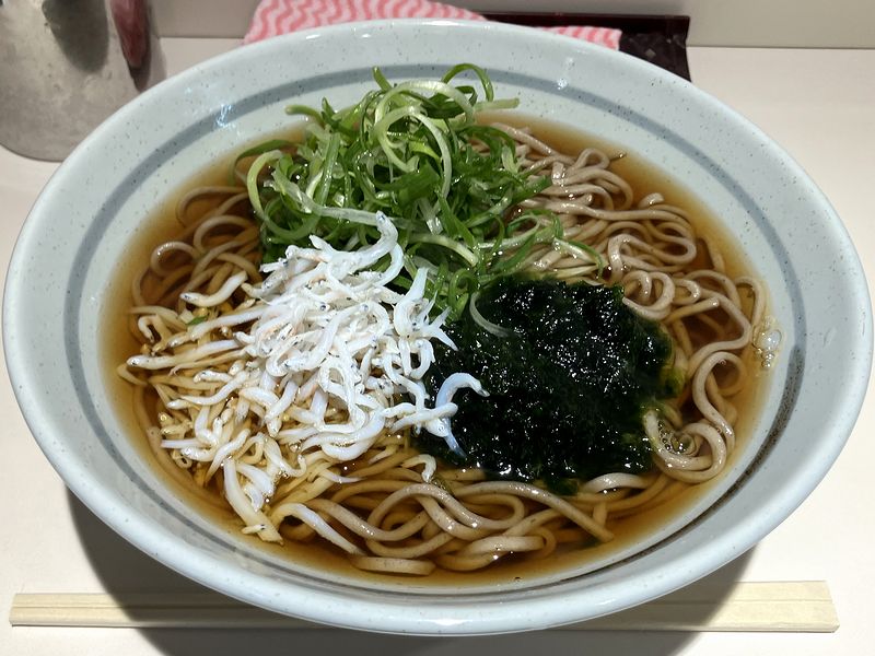 それで今回いただいたそばが、駅名を冠した熱海ソバ。かけそばの上に、アオサとシラスと青ネギが載っています。
