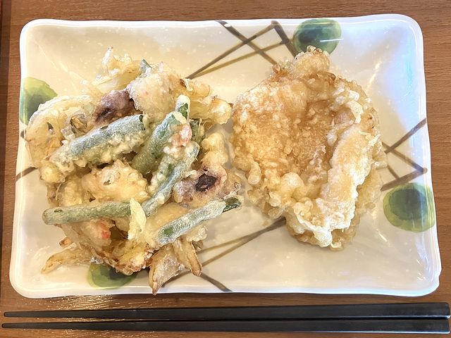 それでますずは見た目ですが、2つの天ぷらが、とってもゴージャス。とくに海老春菊天(春菊と海老のかき揚げ)は、春菊の緑色がきれいで、そこに干しエビの赤と、大根おろしの白が加わって、クリスマスカラーですね。