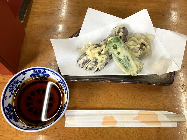 天ぷら三品は、ナス、ピーマン、そして小ぶりな椎茸が2枚という構成。大根おろしと天ツユが添えられていました。