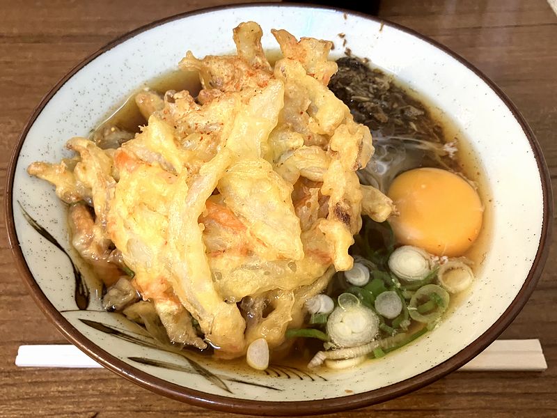 またかき揚げは、さすがに揚げ置きですが、衣はカリっとクリスピーで、タマネギメインのタネはしっとり柔らかく、ツユに溶けるタイプではないけど馴染みは悪くないです。
