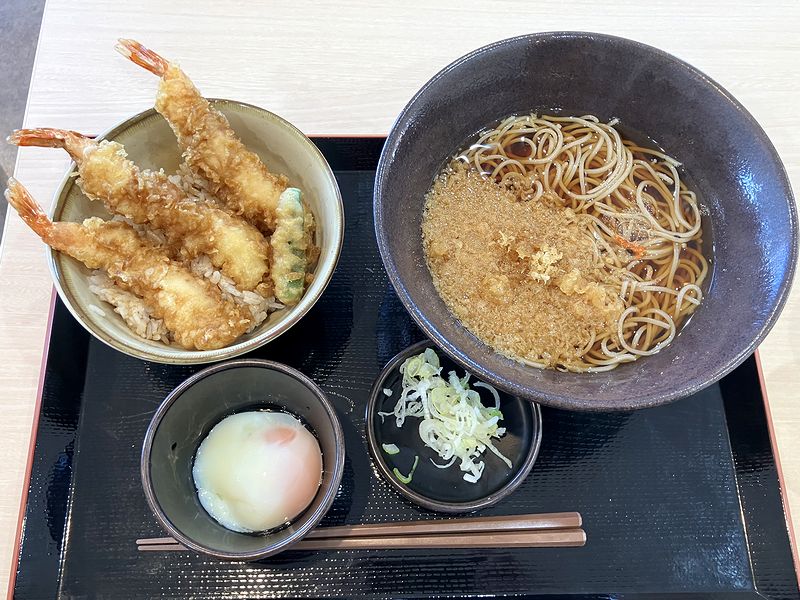 で、この日はランチタイムにお伺いしたのですが、ゆで太郎さんには午前11時以降に注文できる、蕎麦(冷or温)とご飯もの(丼やカレー)がセットになった「日替わり得セット」というメニューがあるので、折角だから今回はそれをいただこうかと。ちなみにこの日は月曜日なので、セットで付くご飯ものはミニ三海老天丼になります。