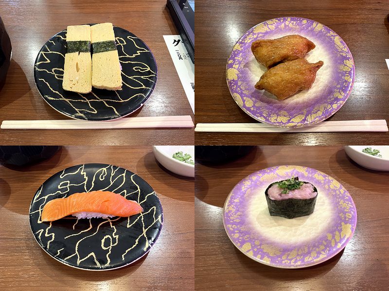 【玉子握り 160円、いなり 120円、1貫 サーモン 140円、1貫 ねぎとろ 140円】