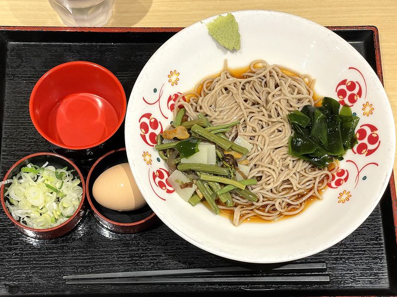 それが、朝限定の、朝食冷しそば。ぶっかけそばに山菜とワカメが載り、半熟卵が付いた品です。