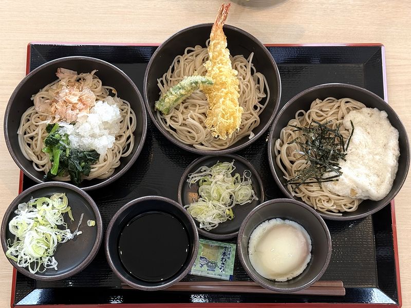 ゆで太郎さんの6月の期間限定メニューは、冷そばやミニ丼セットでいただいた、個人的には初となる「夏野菜と小柱のかき揚げ」ですが、その他にもう一つ、以前も期間限定で出ていた(そして食べた)冷そば三種盛りの、太郎三昧そばもあったんですよね。