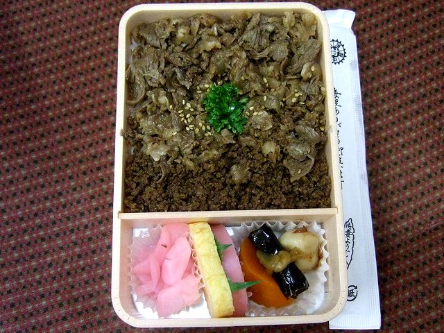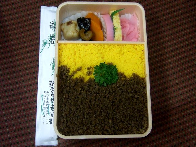 で、そのうちの1つは、結構有名な駅弁だと思う『牛肉どまん中』。山形新幹線の開業時に発売開始となり、今やすっかり全国区というか、駅弁大会などでもお馴染みなのではないでしょうか?それでまず、蓋を開けると、甘辛く煮た牛肉とそぼろが、ご飯が見えない程びっしりと載っているのですが、それを溢さないよう気をつけながら頬張れば、牛肉とお米の美味しさが口の中一杯に。で、もちろん牛肉は美味しいのですが、それに負けず劣らず美味しいのが山形県産米『どまんなか』のご飯かと。またおかずは、小芋や昆布などの煮物にお新香(大根の桜漬け)、そして卵焼きとカマボコが添えられていて、どれも丁度良い箸休めになりますね。