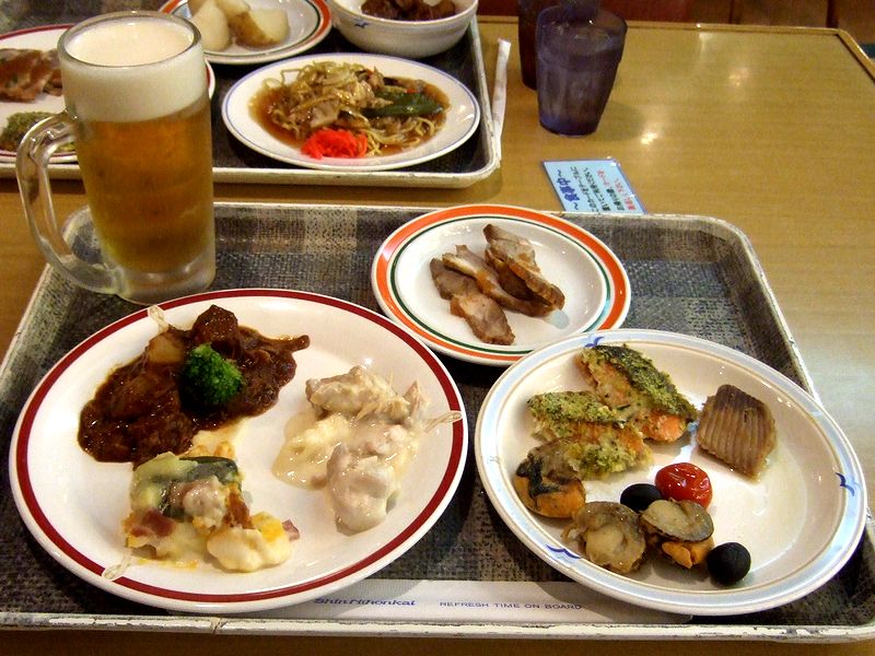 前述のとおり、北海道の苫小牧からから本州の秋田へとフェリーで渡ったのですが、その船内でいただいた夕食がこちら。ちなみにこちらの航路では、朝・昼・夕食ともレストランでの食事はバイキング形式のみとなっているのですが、他にも、お気軽な『カフェ』や、4~10月の間はコース料理のいただける高級な『グリル』もあります。